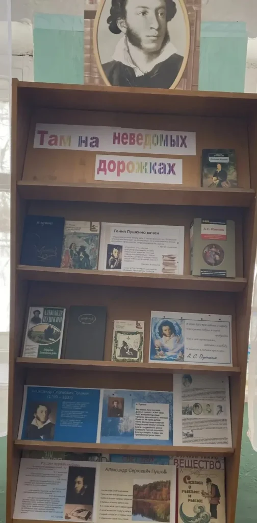 В сельской библиотеке ко Дню памяти А. С. Пушкина оформлена тематическая выставка «Там на неведомых дорожках». Все желающие могут не только посмотреть книги, но и взять почитать.